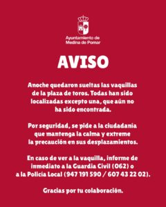 El Ayuntamiento de Medina de Pomar, pide «precaución en los desplazamientos». Durante la madrugada previa al Día de Nuestra Señora del Rosario, seis vaquillas escaparon del corral de la plaza de toros de Medina de Pomar por causas que aún se desconocen, y a las 22 de la noche, según confirma la Guardia Civil, una de ellas todavía no ha sido localizada. No se descarta que se trate de un acto vandálico, aunque por el momento no hay confirmación oficial sobre lo ocurrido.