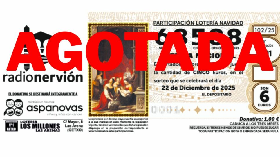 Este miércoles se han agotado todas las participaciones de la Lotería de Navidad 2025 de Radio Nervión. Con el número 68.588 como protagonista. Cada participación costaba 6 euros, de los cuales 1 euro irá destinado a Aspanovas, la asociación que trabaja en favor de los niños y niñas con cáncer.