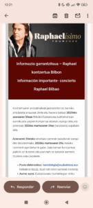 La organización ha informado que el concierto de Raphael previsto para el 30 de noviembre de 2025 en el Palacio Euskalduna queda oficialmente aplazado al 29 de marzo de 2026, debido a motivos internos de organización.