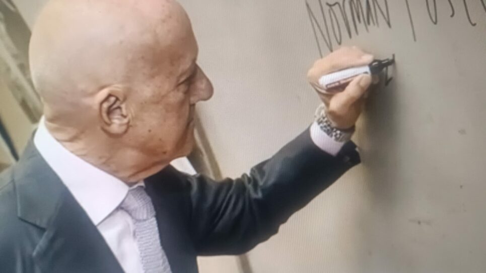 Pero no fue el único detalle que dejó huella. Sir Norman estampó su firma en una de las estaciones del trazado: la de Moyúa. Su rúbrica, grabada sobre una de las placas del acceso, permanece allí como testimonio del vínculo entre el arquitecto británico y la ciudad.