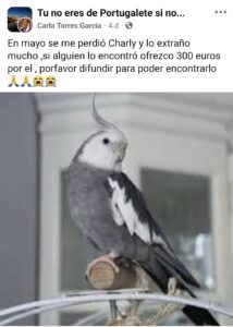 300 euros por encontrar a Charly. Esta es la recompensa que ofrece la dueña de este pájaro que desapareció en Portugalete el pasado 21 de mayo. Desde entonces Carla, que así se llama la mujer, no sabe nada de este ninfa que para ella era mucho más que un animal. Por ello en su día ya ofreció una recompensa de 200 euros que ahora ha incrementado por si alguien ha encontrado a Charly, que como dato importante, tiene anilla en las dos patas.