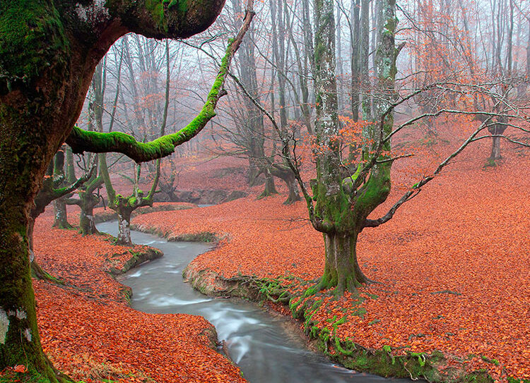 Entre montañas y la bruma que forma la niebla, en el límite entre Bizkaia y Araba, encontramos un lugar en donde la naturaleza parece desafiar las leyes del tiempo. El Hayedo de Otzarreta, en pleno Parque Natural de Gorbeia, es uno de los rincones más fotografiados de Euskadi, que sorprende a quien lo visita con su aspecto casi sobrenatural. Y es que su hayas centenarias parace que crecen al revés. Y es que extienden sus ramas hacia el cielo, cubiertas de musgo y rodeadas por un pequeño arroyo, el Zubizabala, que divide el bosque en dos. Es fácil entender por qué este rincón se ha ganado el apodo de “bosque encantado del Gorbea”.