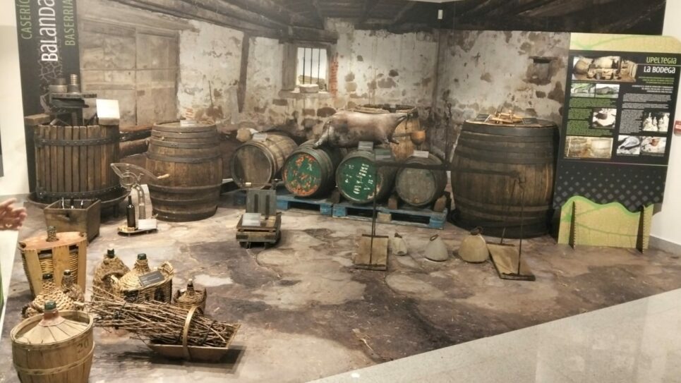 El espacio reproduce con fidelidad el ambiente rural en el que familias baserritarras elaboraban chacolí durante siglos. En él destacan prensas antiguas, recipientes de madera, utensilios de trabajo y objetos etnográficos que permiten entender cómo se producía el vino antes de la industrialización. La recreación del caserío Balanda se integra en un recorrido que combina materiales arqueológicos, documentos, recursos audiovisuales y elementos interactivos.