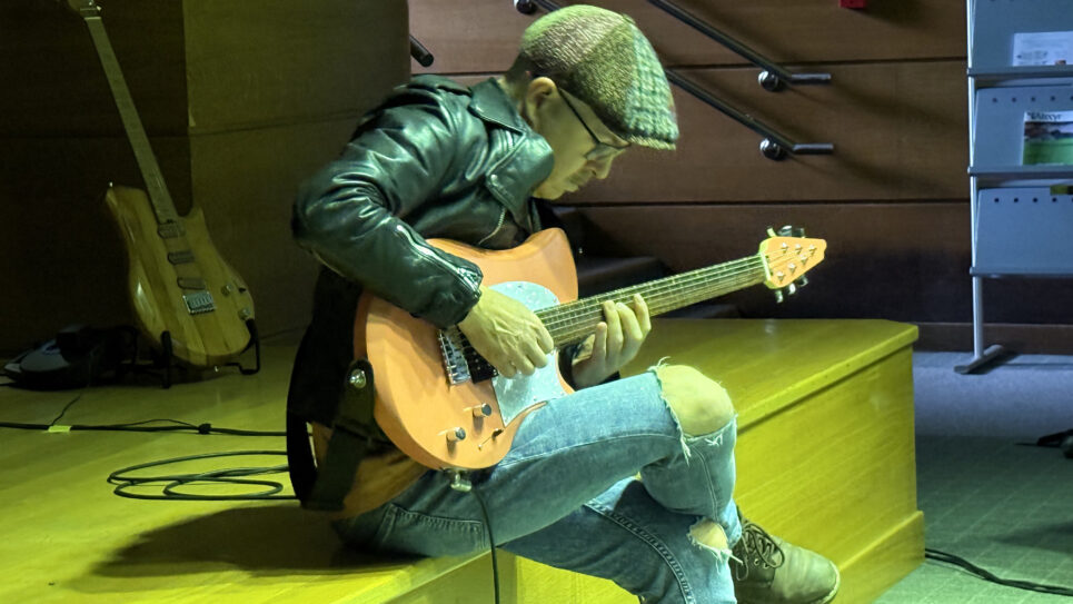 Un grupo de alumnos y alumnas de la Escuela de Ingeniería de Bilbao han entregado a Haimar Arejita, guitarrista de Gatibu, la guitarra que tocará en el cierre de gira ‘Agur esan barik’ del grupo vasco.