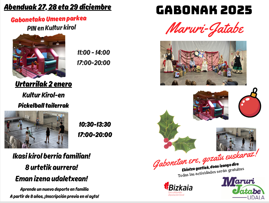 El Ayuntamiento de Maruri-Jatabe ha diseñado una programación especial de Navidad pensada para el disfrute familiar y la puesta en valor de las tradiciones vascas, con una agenda que combina cultura, ocio infantil y deporte. Todas las propuestas serán gratuitas y se desarrollarán entre el 22 de diciembre y el 2 de enero.