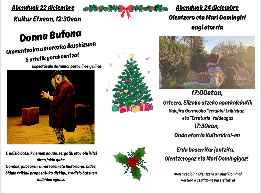 La programación arrancará el 22 de diciembre con una propuesta cultural dirigida al público infantil. La Kultur Etxea acogerá a las 12:30 horas el espectáculo teatral Donna Bufona, una función familiar que combina humor y narración para acercar a niñas y niños a distintas tradiciones culturales a través del juego y la imaginación.