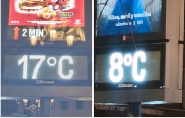 Bilbao ha despertado hoy con un cambio térmico tan llamativo como visible. A las ocho de la mañana, dos termómetros situados en distintos puntos de la ciudad reflejaban una caída de hasta diez grados con respecto a ayer: de los 17 ºC registrados el martes se ha pasado hoy a apenas 8 ºC, e incluso menos en algunos momentos de la madrugada. Todo ello acompañado de un cielo despejado que ha dejado estampas especialmente espectaculares al amanecer.