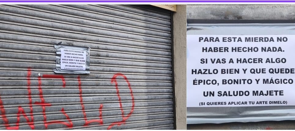 Alex tenía un comercio de informática que tuvo que cerrar hace unos años y mantiene el local para uso propio. Le ha dolido el destrozo y la forma de hacerlo, por eso no ha dudado en dejar un cartel con un mensaje muy claro: «Para esta mierda no haber hecho nada. Si vas a hacer algo, hazlo bien y que quede épico, bonito y mágico. Un saludo majete». A esta respuesta también le ha añadido una propuesta:»Si quieres aplicar tú arte, dímelo».