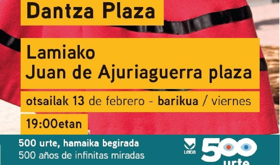 El programa conmemorativo del 500 aniversario de Leioa continúa este viernes, 13 de febrero, con la celebración de la segunda jornada de ‘Dantza Plaza 500’, una propuesta cultural abierta y participativa que tendrá lugar en la plaza Juan de Ajuriaguerra de Lamiako, frente a la estación de metro, a partir de las 19.00 horas.
