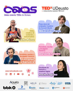 TEDxUDeusto celebra diez años de trayectoria y lo hace con su edición más ambiciosa hasta la fecha. El evento, que se ha consolidado como el único TED oficial de Bizkaia, vuelve con un formato renovado, una producción más grande y un concepto central que define el espíritu de esta edición: CAOS. Un guiño a la incertidumbre contemporánea, pero también a la creatividad, la reinvención y la búsqueda de sentido en tiempos convulsos.