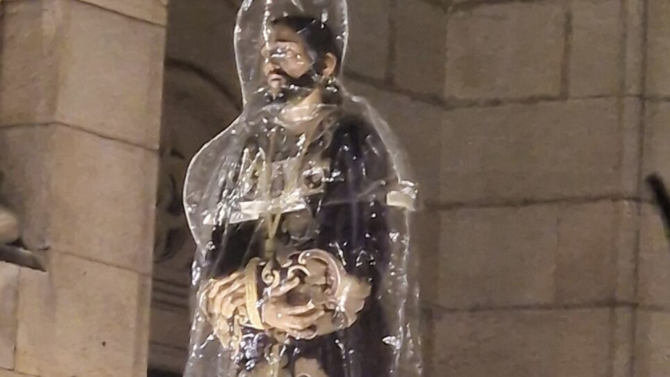 No hay lluvia que frene la pasión de Bilbao por su Nazareno. La procesión de las saetas y las castañuelas se celebra a pesar de que el tiempo ha generado dudas entre los cofrades. No caía mucha agua a las 20:30h, hora prevista del arranque, pero se han estudiado las previsiones y ha ganado el ‘sí’. Casi media hora más tarde, de lo marcado, se veía salir al Nazareno por la puerta de la Quinta Parroquia. Y una hora después todavía le estaban preparando, protegiéndole con un plástico.