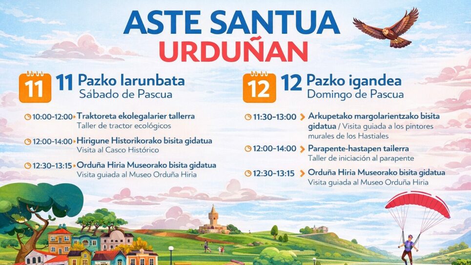 El sábado arranca con un taller de teñido ecológico de 11.00 a 13.00 horas, al que siguen una visita guiada al Casco Histórico de 12.00 a 14.00 y la sesión matinal en el Museo Orduña Hiria, de 12.30 a 13.15. El domingo, por su parte, ofrece entre las 11.30 y las 13.00 un recorrido guiado por las pinturas murales de los Hastiales, y de 12.00 a 14.00 el taller de parapente. El museo completa la jornada con su visita habitual de 12.30 a 13.15.