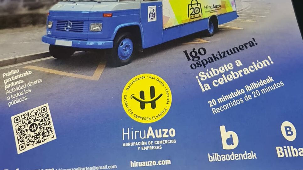 La asociación Hiruauzo, que agrupa al comercio, hostelería y empresas de Ibarrekolanda, San Inazio y Elorrieta, celebra este 16 de abril su 20 aniversario con un acto institucional en el Centro Merkatu de Bilbao. El encuentro reunirá a representantes institucionales, asociaciones comerciales y negocios locales para poner en valor la importancia del comercio de proximidad como motor económico y social de los barrios.