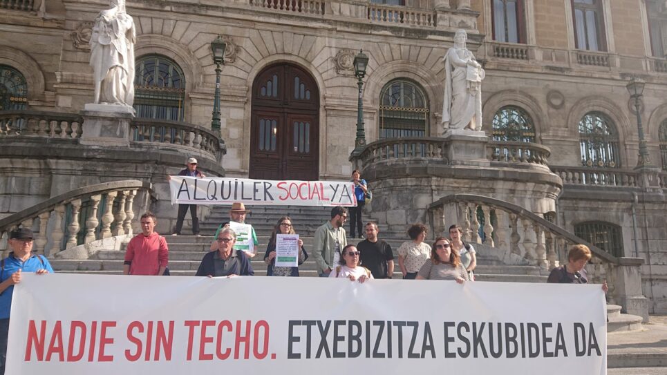 Los colectivos sociales por el derecho a la vivienda se han manifestado frente al Ayuntamiento de Bilbao para denunciar la política de vivienda municipal. Consideran que la situación es cada vez más alarmante. Aseguran que le precio de la vivienda no para de aumentar y que sin medidas de las administraciones el problema no se puede atajar.