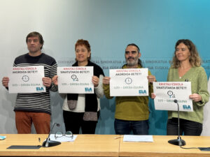 ELA ha convocado una jornada de huelga el 20 de enero en los centros de enseñanza de iniciativa social en la Comunidad Autónoma Vasca para exigir el cumplimiento del acuerdo de fin de huelga firmado en 2024. Han pasado 20 meses desde que ELA firmara el acuerdo de fin de huelga con las patronales Kristau […]