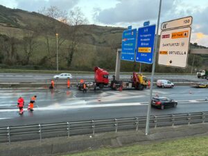 Un camión ha hecho la tijera este lunes en la A-8, a la altura de Santurtzi y pasada la zona de Ugaldebieta, generando importantes problemas de circulación. El accidente, registrado alrededor de las 13.37 horas y que no ha causado heridos, mantiene cerrados dos de los tres carriles en sentido Bilbao, lo que está complicando […]