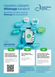 Amorebieta-Etxano se une a otros municipios de Bizkaia y cuenta ya con un nuevo canal de WhatsApp para mantener a la ciudadanía informada de manera directa y cercana. Asi, la población podrá recibir directamente en sus móviles avisos, noticias o información sobre eventos municipales. El canal será unidireccional, lo que significa que estará destinado exclusivamente […]