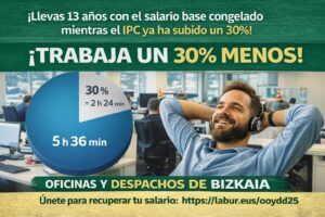 Las personas trabajadoras de oficinas y despachos de Bizkaia llevan más de una década sosteniendo su sector sin un marco laboral actualizado. El convenio colectivo lleva 12 años decaído y las tablas salariales no se revisan desde hace 13 años, una situación que ha provocado una pérdida acumulada de poder adquisitivo cercana al 30%, en […]