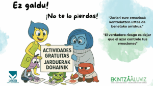 Educación Leioa celebra el Día sin Juegos de Azar con una jornada dedicada a las emociones infantiles 14 de octubre de 2025 por Iker Fernández | Deja un Comentario El Ayuntamiento de Leioa, en colaboración con la asociación Ekintza Aluviz, celebrará este sábado 18 de octubre una jornada especial con motivo del Día sin Juegos de Azar. Bajo el lema El circuito de las emociones, la cita se desarrollará en Euskal Etxeen Plaza de 10:00 a 13:00 horas, con actividades dirigidas a niños y […] Lea más » TaggedDía sin Juegos de Azar Ekintza Aluviz Leioa